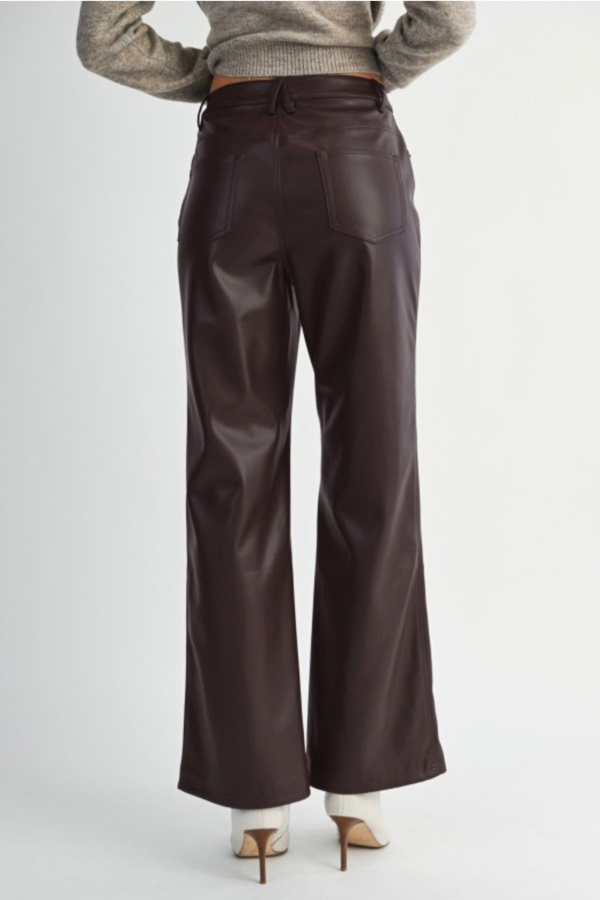 High-waisted faux leather pants with a straight leg fit. Designed with belt loops, side and back pockets, and a front zip fly with button closure.