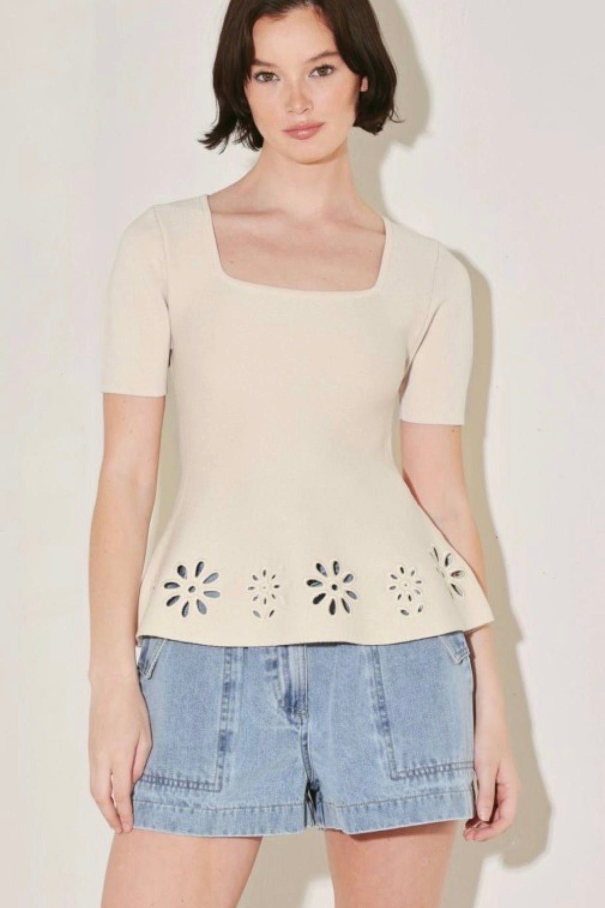 A knit top featuring a square neckline, short sleeve and eyelet cut out detail.