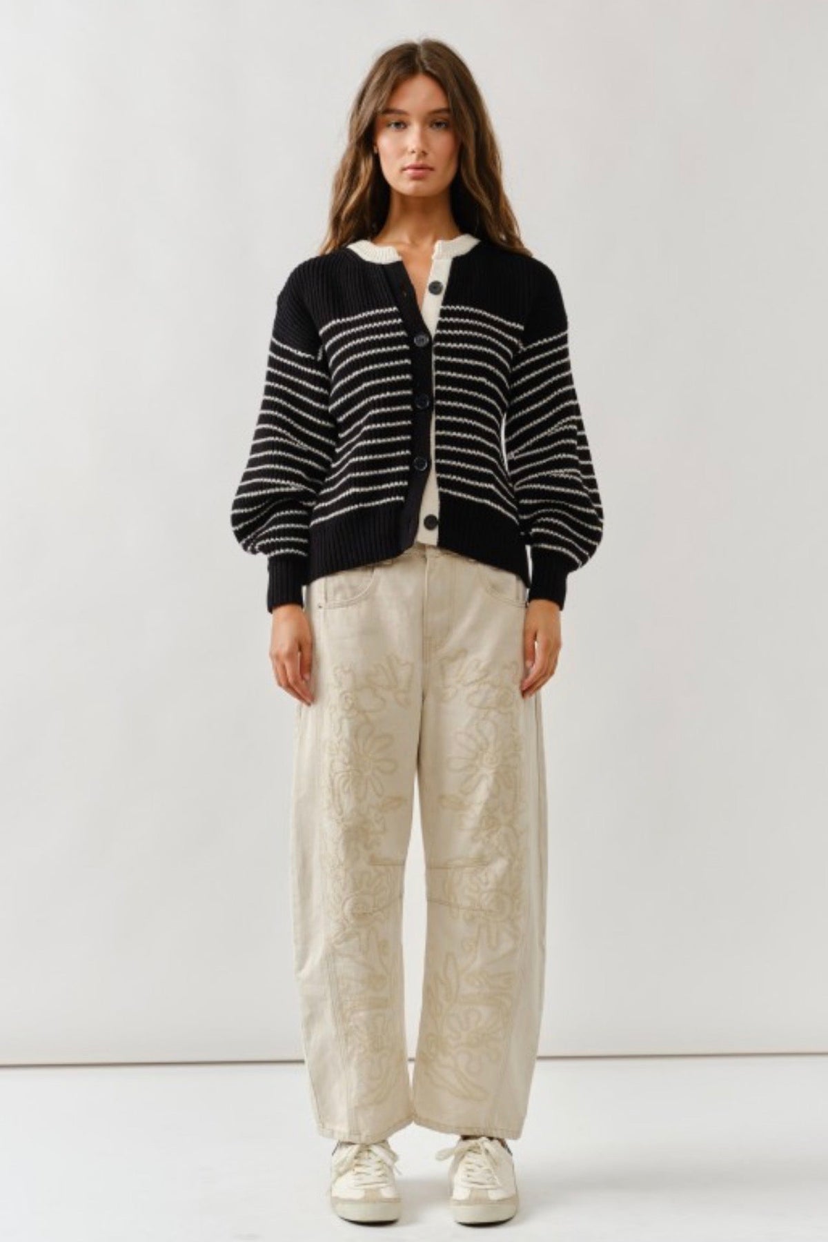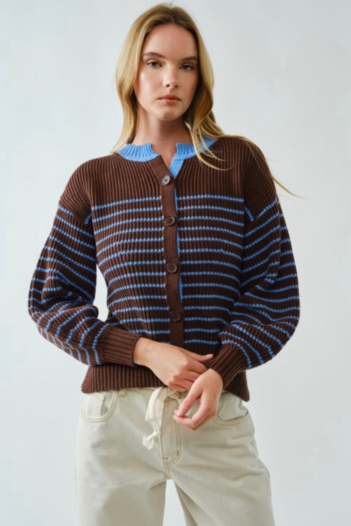 Add a modern twist to a classic look with this voluminous sleeve stripe cardigan. Featuring bold horizontal stripes, contrast trim details, and oversized balloon sleeves. The ribbed knit texture adds dimension, while the button-down front makes layering effortless.