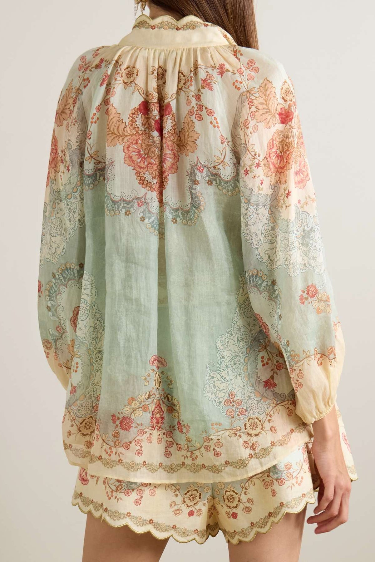 Linen top with a natural, airy texture, with an artful print and scalloped stand collar.