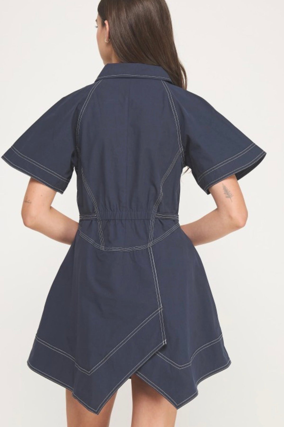 Top stitch detail collared mini shirt dress in cotton poplin fabric. This mini shirt dress features top-stitch detail throughout, spread collar, hidden placket button down closure at front, raglan sleeve, cinched waist with elastic at back, side pockets & asymmetric hem.