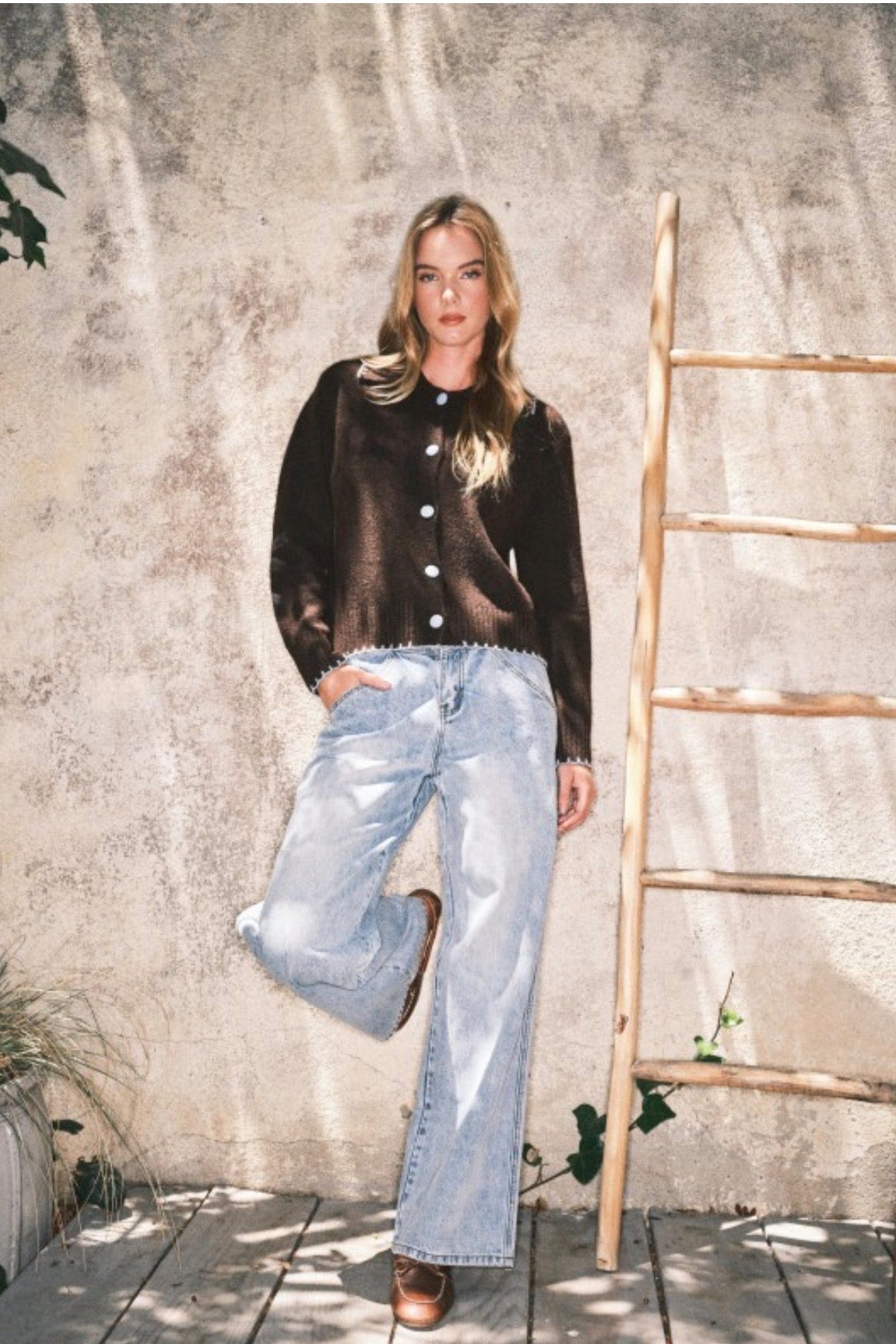 This collared sweater cardigan is crafted from a soft knit, it features bold contrast stitching along the hem and collar for a modern twist. The button-down front with oversized buttons adds a playful classic touch.