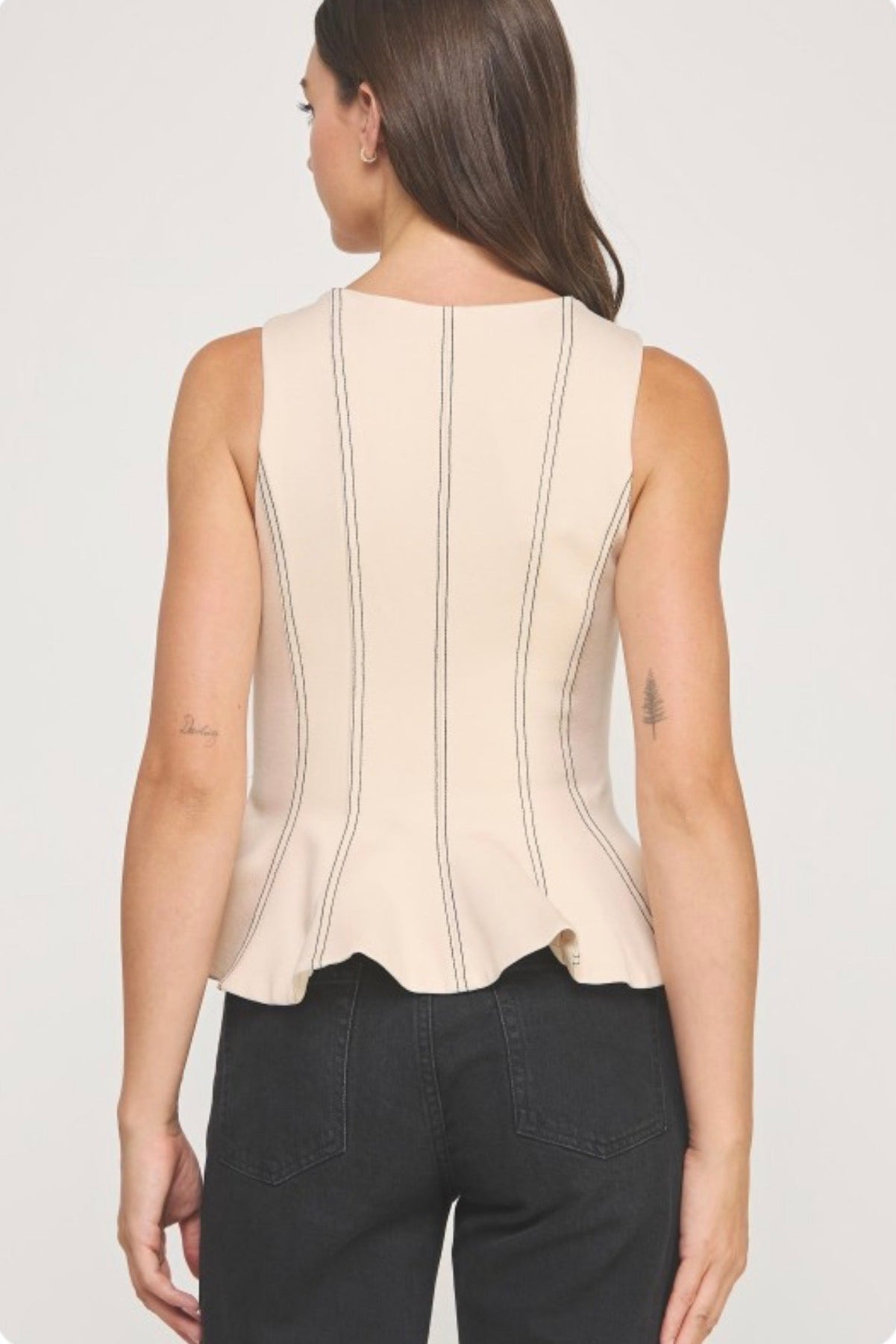 Top stitch peplum sleeveless top in a stretch ponte fabric. This versatile sleeveless peplum top features top-stitch detail throughout, ruffle hem, round neck, and a hidden zipper closure.