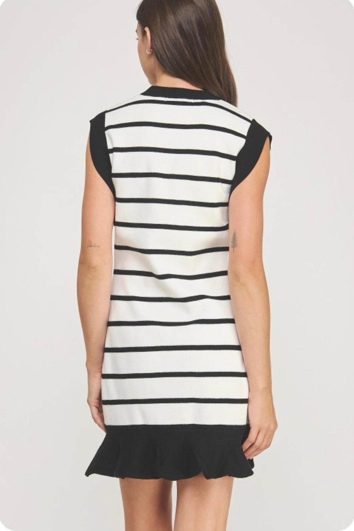 Sleeveless sweater mini dress in stripe stretch knit fabric. This sleeveless mini dress features a ribbed round neck, shoulder ribbed panel with button detail, and flounce ruffle ribbed hem.