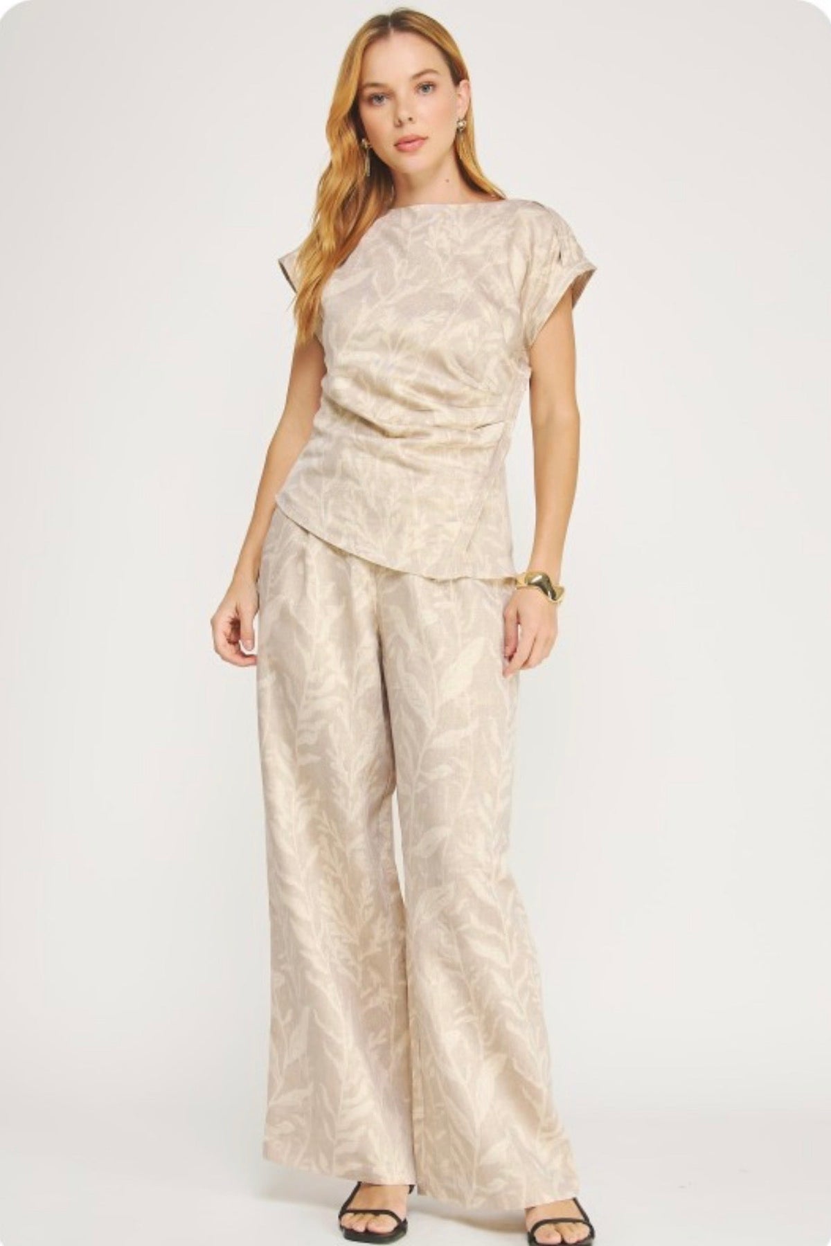 Wide leg pants in textured floral jacquard fabric. These trousers feature wide straight leg, elastic back waist, button and clasp with zipper fly closure.