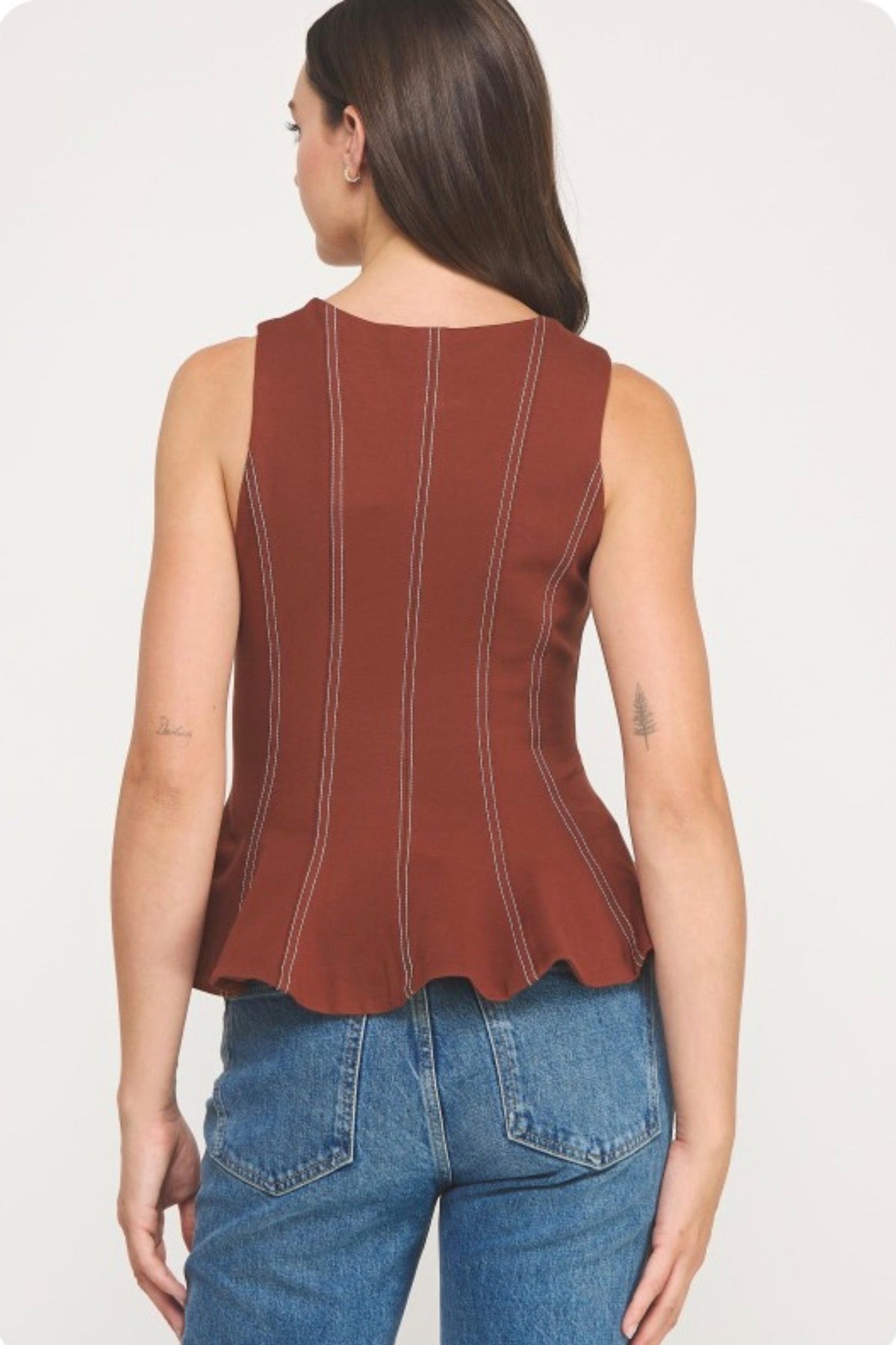 Top stitch peplum sleeveless top in a stretch ponte fabric. This versatile sleeveless peplum top features top-stitch detail throughout, ruffle hem, round neck, and a hidden zipper closure.